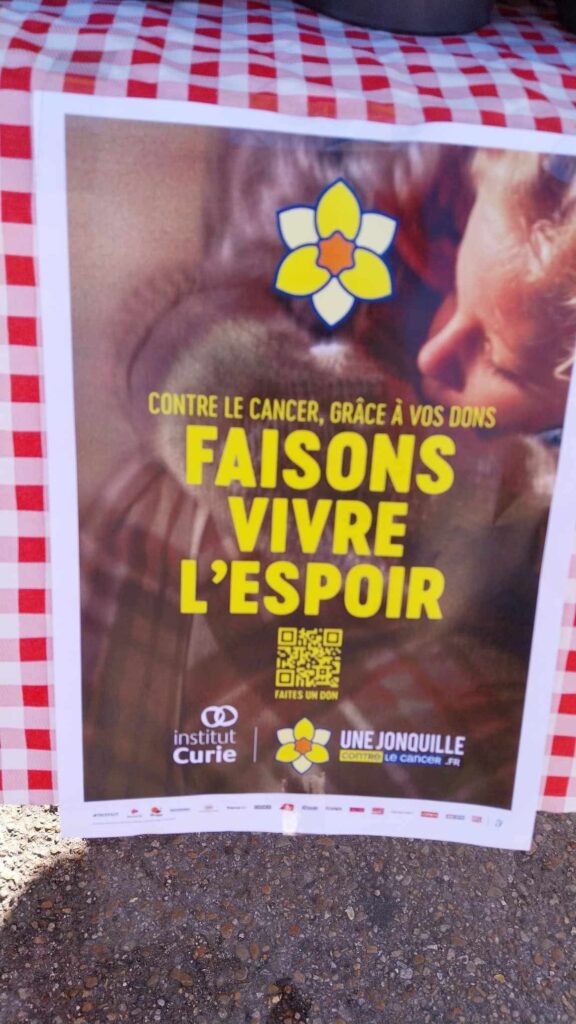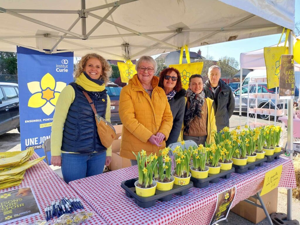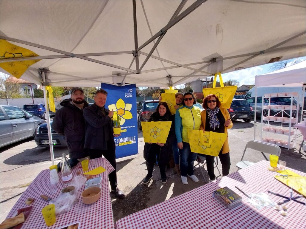 Nous vous proposons des jonquilles, ainsi que des cabas, stylos 4 couleurs, pin’s et magnets, au profit de l’Institut Curie.